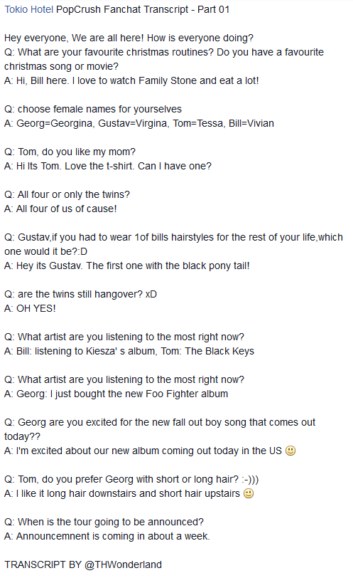 TH: Gustav é agressivo, Georg é emotivo, Tom é engraçado e o Bill nunca bebe :)