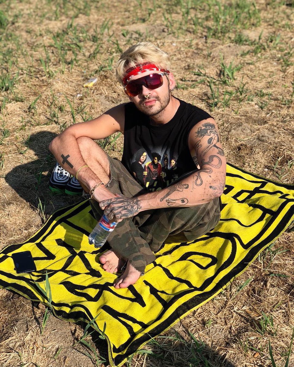 @billkaulitz na sessão de ioga hoje de manhã no acampamento de verão do Tokio Hotel vestindo a camiseta vintage e relaxando na nossa nova toalha de verão MDLA